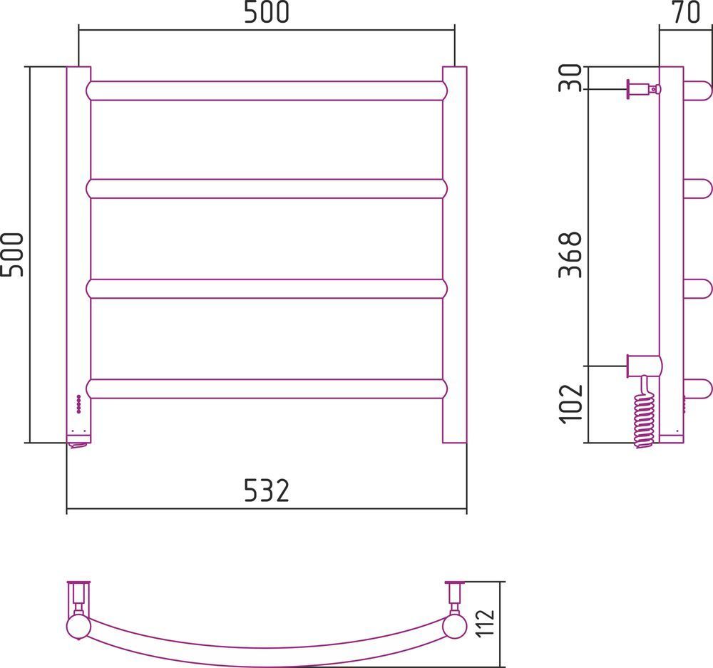 Полотенцесушитель электрический Сунержа Галант 4.0, размер 500х532 мм, 4 перекладины. Мощность 72 Вт, цвет белый матовый. Интегрированное в корпус скрытое подключение.