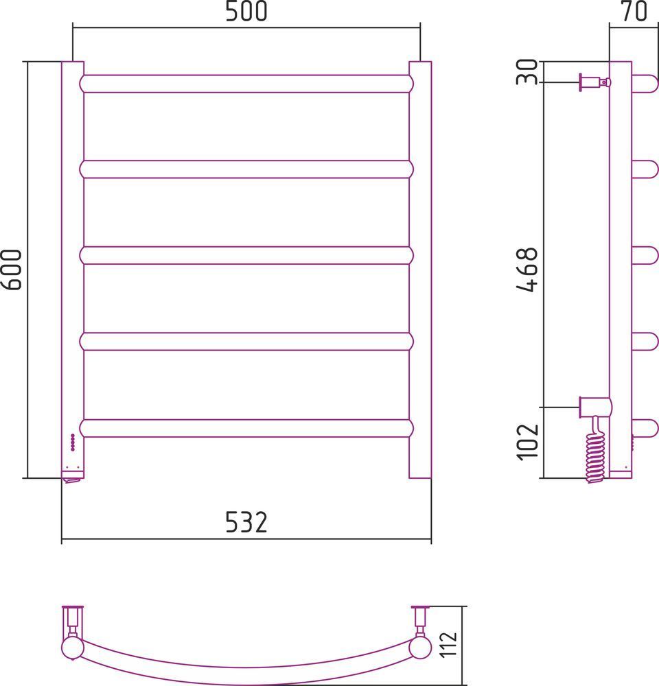 Полотенцесушитель электрический Сунержа Галант 4.0, размер 600х532 мм, 5 перекладин. Мощность 90 Вт, цвет белый матовый. Интегрированное в корпус скрытое подключение.