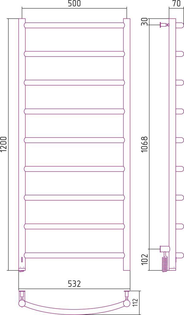 Полотенцесушитель электрический Сунержа Галант 4.0, размер 1200х532 мм, 8 перекладин. Мощность 168 Вт. Интегрированное в корпус скрытое подключение.