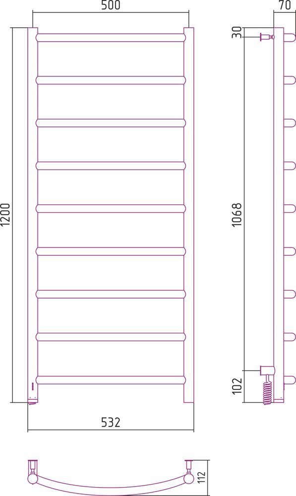 Полотенцесушитель электрический Сунержа Галант 4.0, размер 1200х532 мм, 8 перекладин. Мощность 168 Вт, цвет тёмный титан муар. Интегрированное в корпус скрытое подключение.