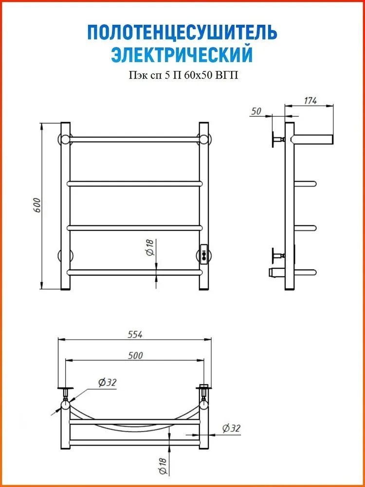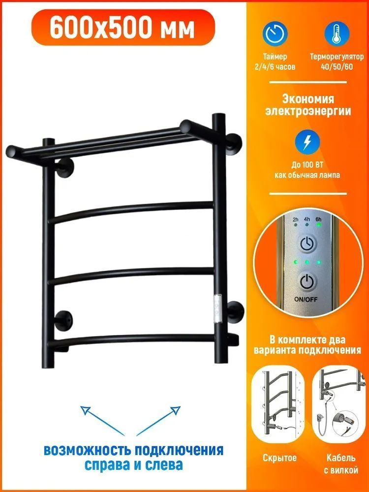 Полотенцесушитель электрический Тругор Пэк сп 5 ВГП с полкой П4 500х600 мм, чёрный (возможность скрытого подключения) 00-00042757