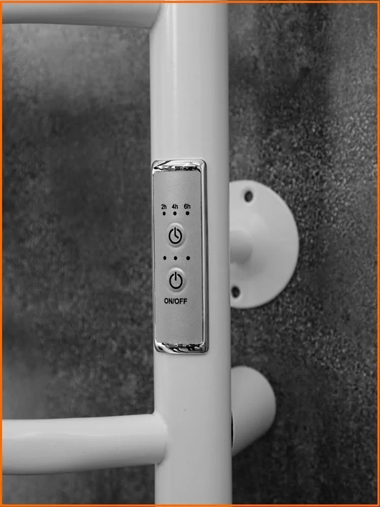 - Экономичность: Полотенцесушитель снабжен панелью управления. Кнопка включения/выключения и таймер на 2 ; 4 ; 6 часов , который позволяет включать изделие на ограниченное время. Эта функция дает возможность экономить электричество.