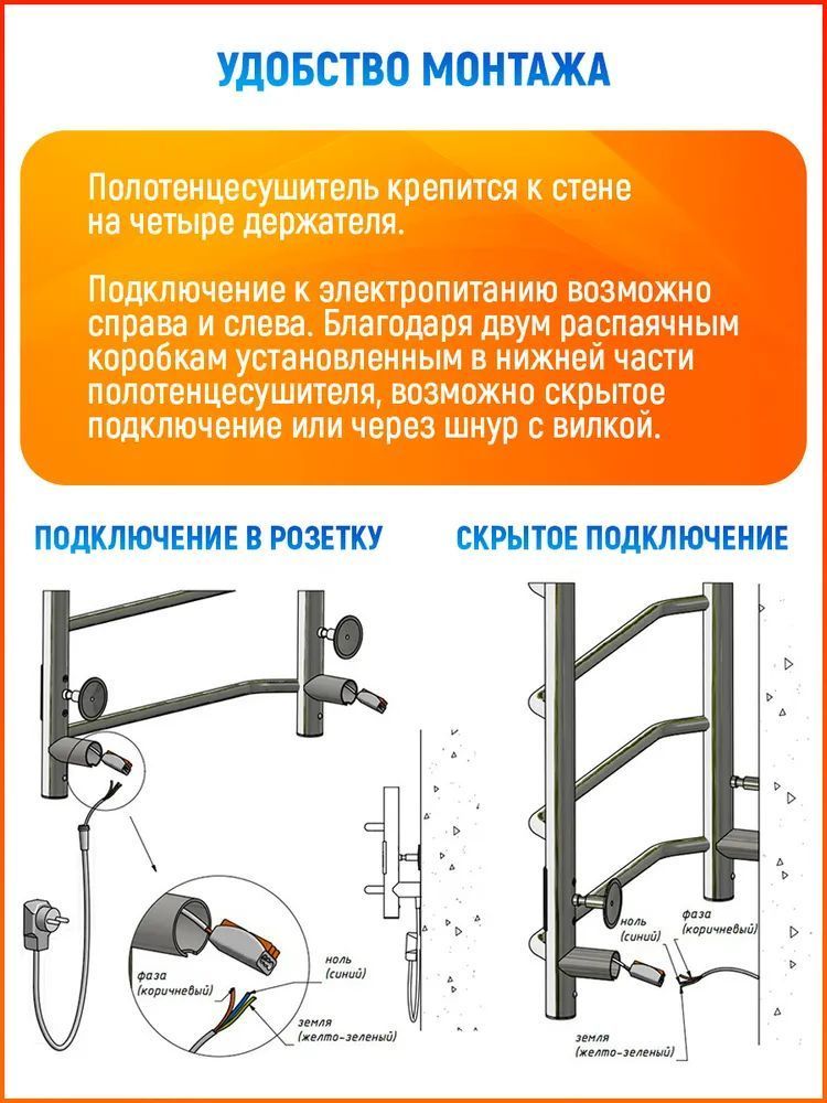 - Удобство монтажа: Полотенцесушитель крепится к стене на четыре держателя. Универсальное исполнение изделия позволяет подключить его, как справа, так и слева.