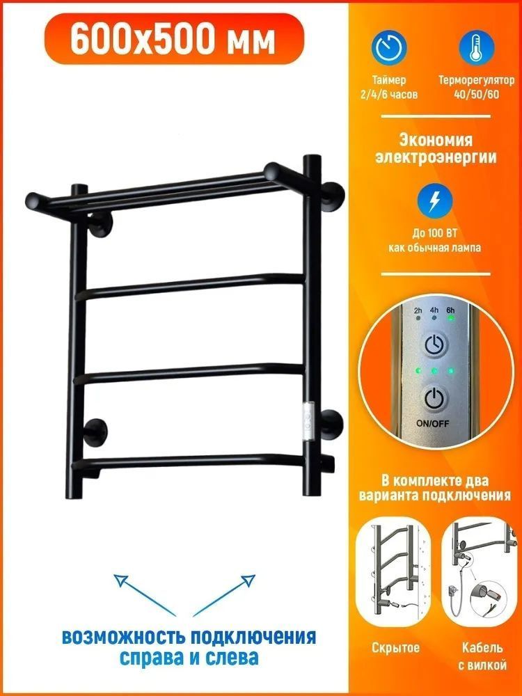 Полотенцесушитель электрический Тругор Пэк сп 6 ВГП с полкой П4 500х600 мм, чёрный (возможность скрытого подключения) 00-00042763
