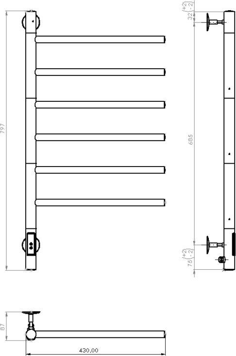 Полотенцесушитель электрический Vincea VTD-1S2CGE, размер 430x797х87 мм, 6 перекладин, мощность 65 Вт, цвет графит. Возможность скрытого подключения.