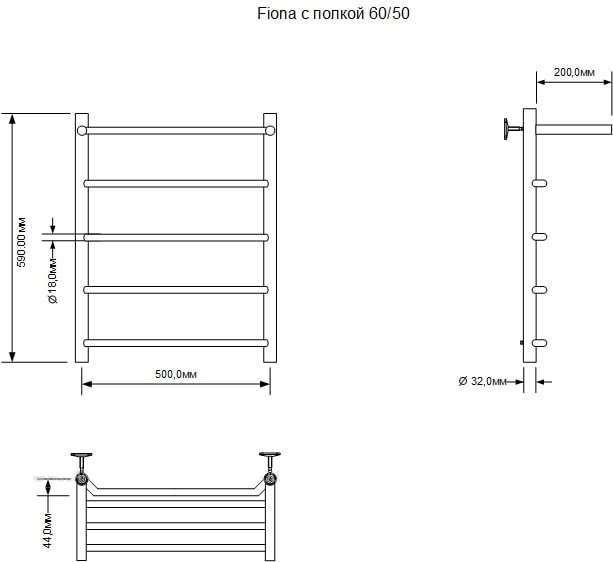 Полотенцесушитель водяной Aquanet Fiona с полкой, 5 перекладин, размер 500х590 мм, цвет хром.