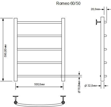 Полотенцесушитель водяной Aquanet Romeo, 5 перекладин, размер 500х590 мм, цвет хром.