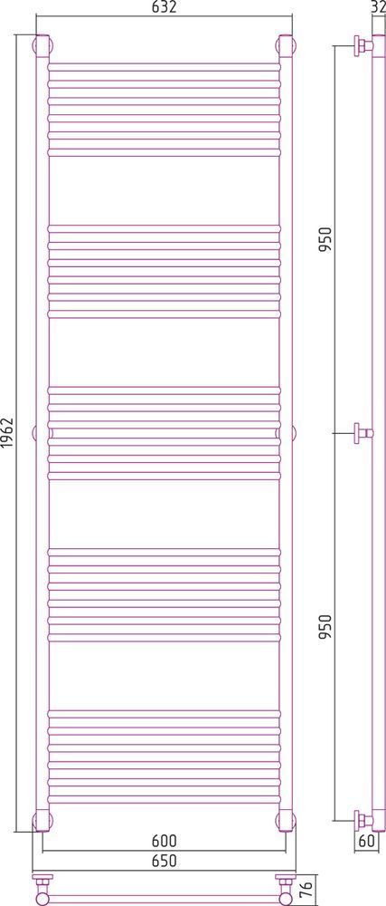 Полотенцесушитель проточный (водяной) Сунержа Богема+ 1900х600 мм, 30 перекладин(6-6-6-6-6). Теплоотдача 1275 Вт. Возможно исполнение с выгнутой перемычкой.