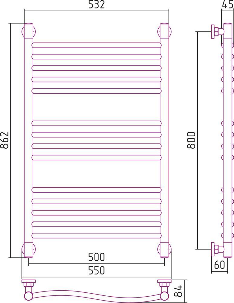 Полотенцесушитель проточный (водяной) Сунержа Флюид+ 800x500 мм, 14 перекладин(5-4-5). Теплоотдача 497 Вт.