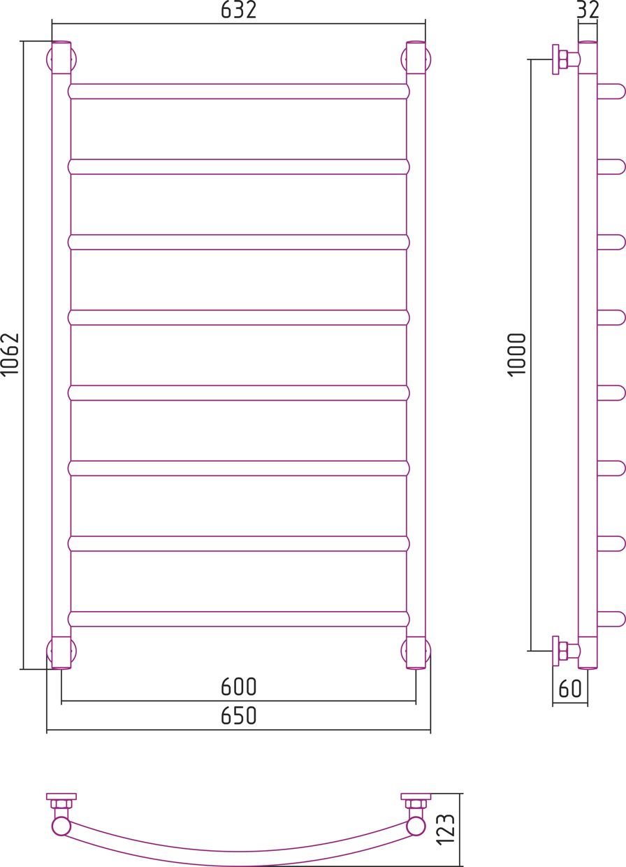 Полотенцесушитель проточный (водяной) Сунержа Галант+ 1000х600 мм, 8 перекладин. Теплоотдача 492 Вт.