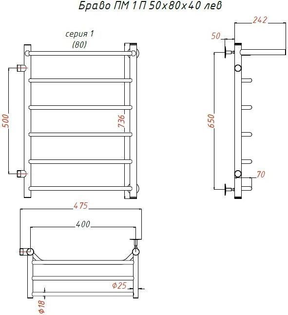 Полотенцесушитель водяной Тругор Браво с полкой и боковым подводом, 6 перекладин, цвет хром. Подключение левое.