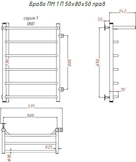 Полотенцесушитель водяной Тругор Браво ПМ1 с полкой и боковым подводом П6 500х800 мм L 00-00017293