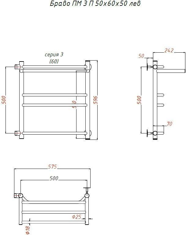 Полотенцесушитель водяной Тругор Браво3 ПМ с боковым подводом и полкой П6 500х600 мм L (м/о 500 мм) 00-00015992
