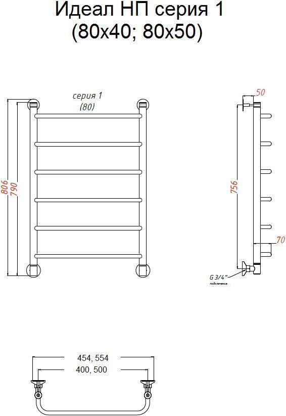 Водяной полотенцесушитель модели 1 серии «Идеал». Изделие имеет небольшие размеры, доступно 5 вариантов от 50х40 см до 80х50 см. В зависимости от выбранных параметров можно выбрать конструкций с 3-6 скобообразными перекладинами.