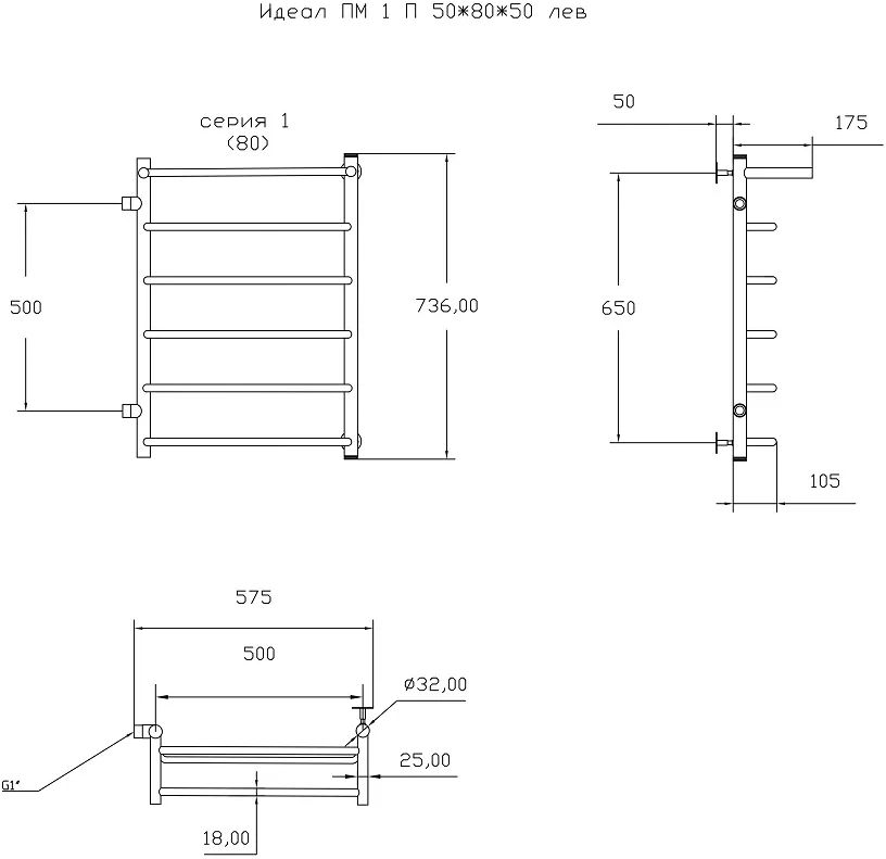 Полотенцесушитель водяной Тругор Идеал ПМ1 с полкой и боковым подводом П6 500х800 мм L 00-00026991