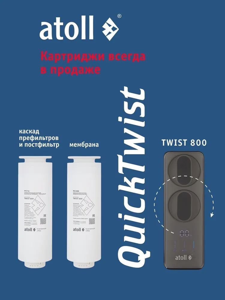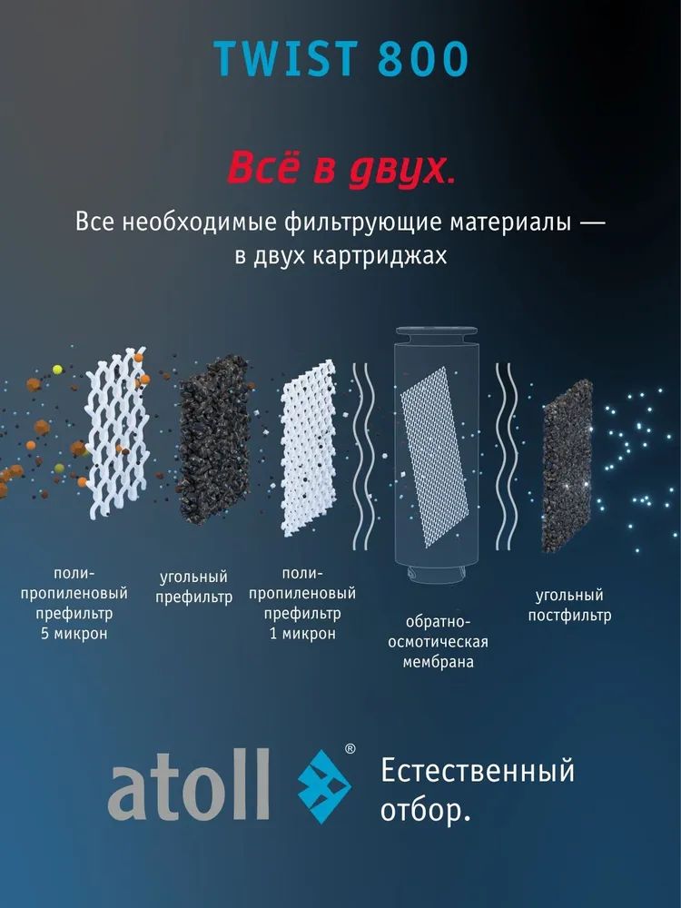 - Сверхмощная обратноосмотическая мембрана atoll 800 TWIST производит в минуту более 2-х литров чистой питьевой воды.
