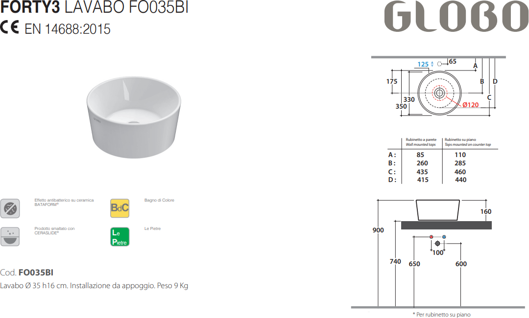 Раковина-чаша Globo Forty3 35 см FO035.BI