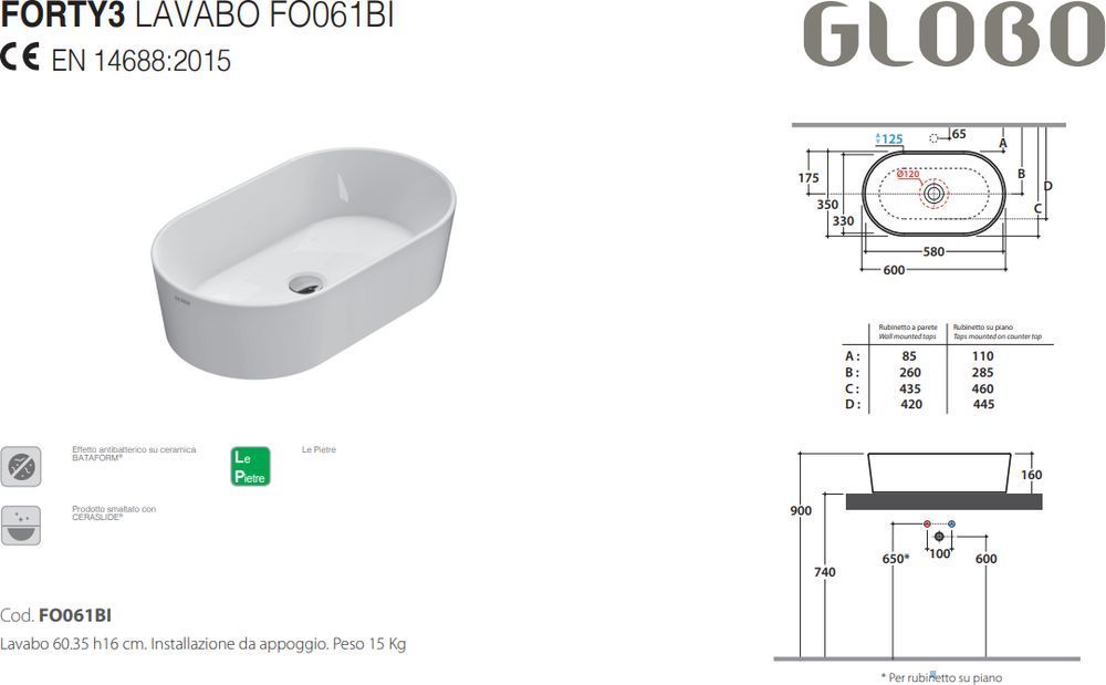 Раковина-чаша Globo Forty3 FO061.BI, размер 600х350 мм, цвет белый.