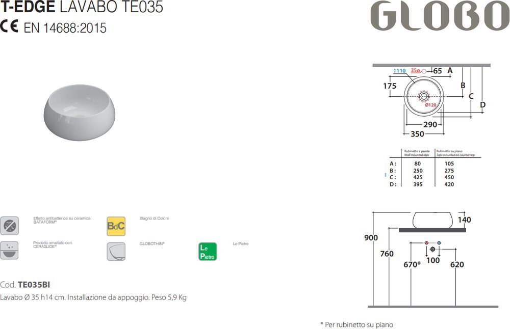 Раковина-чаша Globo T-Edge TE035BI, размер 350х350 мм, цвет белый.