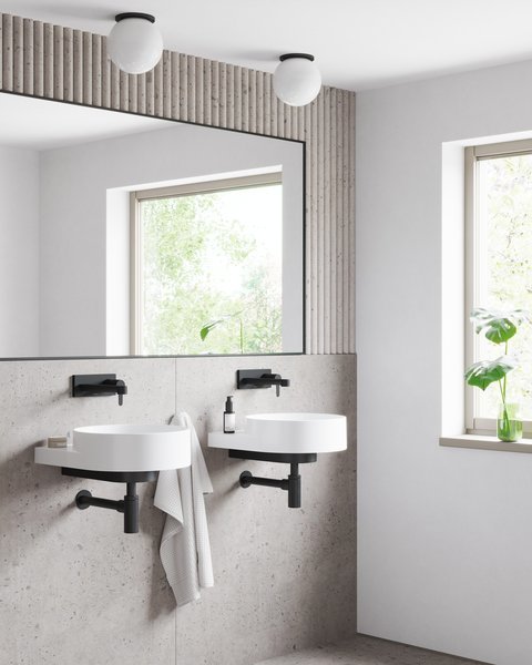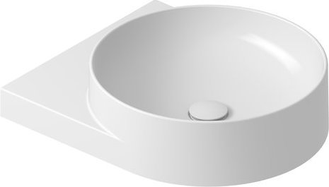 Круглый умывальник дополняется элементом дизайна в виде кронштейна белого/черного цвета или из нержавеющей стали. Магия элегантности объединяет в один тон сочетание консоли, смесителя, сифона и поддона.