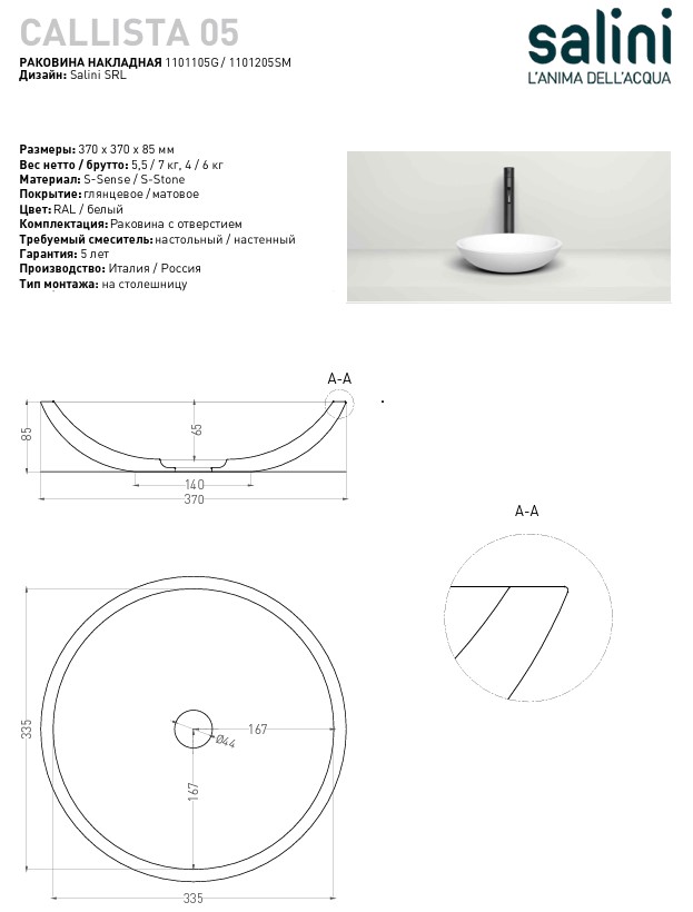 Раковина-чаша Salini Callista 05 36 см 1101205SM (S-Stone) матовая