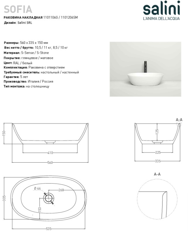 Накладная раковина SOFIA имеет современный силуэт и классическое благородство.