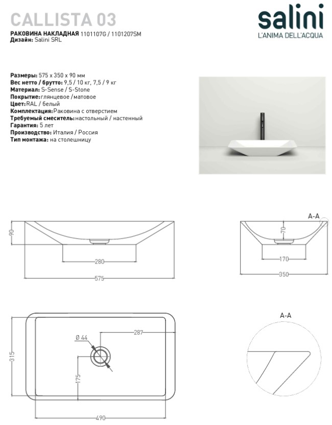 Раковины CALLISTA предназначены для накладного монтажа. Они отличаются изящной формой и небольшой глубиной до 100 мм.