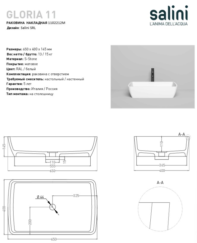 Раковина-чаша Salini Gloria 11 1102212M, размер 650x400x145 мм, цвет белый.