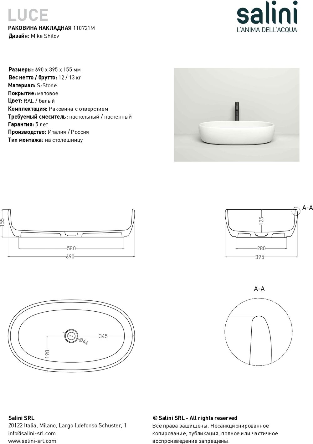 Раковина-чаша Salini Luce 69 см 110721M (S-Stone) матовая