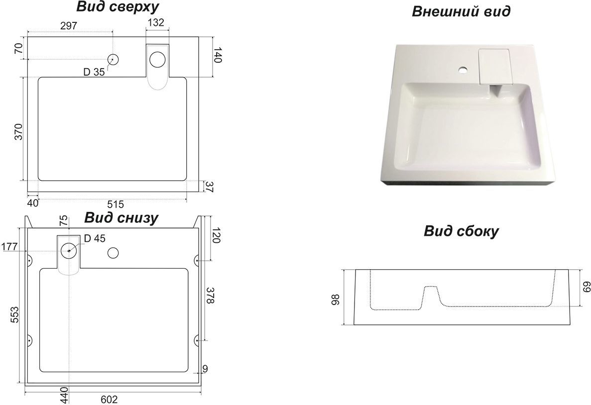 Раковина состоит из натурального молотого мрамора и полиэфирной смолы, покрывается специальным гелькоутом - полимером повышенной прочности и химической стойкости, марки «ViaPal», который имеет сертификат для использования в медицинских учреждениях. Все раковины проходят термообработку в промышленной печи при температуре 80 °C, таким образом выводятся все вредные вещества. Каждая раковина доводится вручную и полируется, поэтому все изделия имеют безупречный внешний вид. Раковина комплектуется кронштейнами и сифоном.