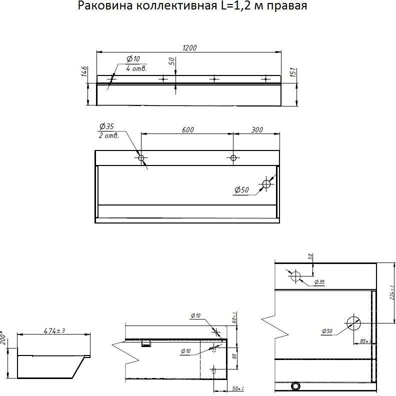 Раковина подвесная антивандальная Тругор L=1,2 м (слив слева)