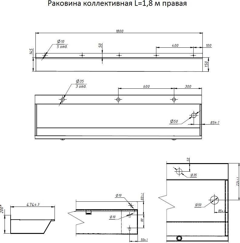 Раковина подвесная антивандальная Тругор L=1,8 м (слив слева)