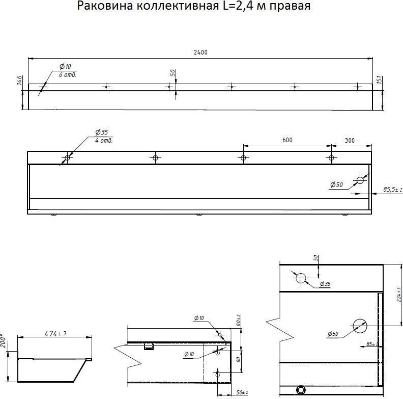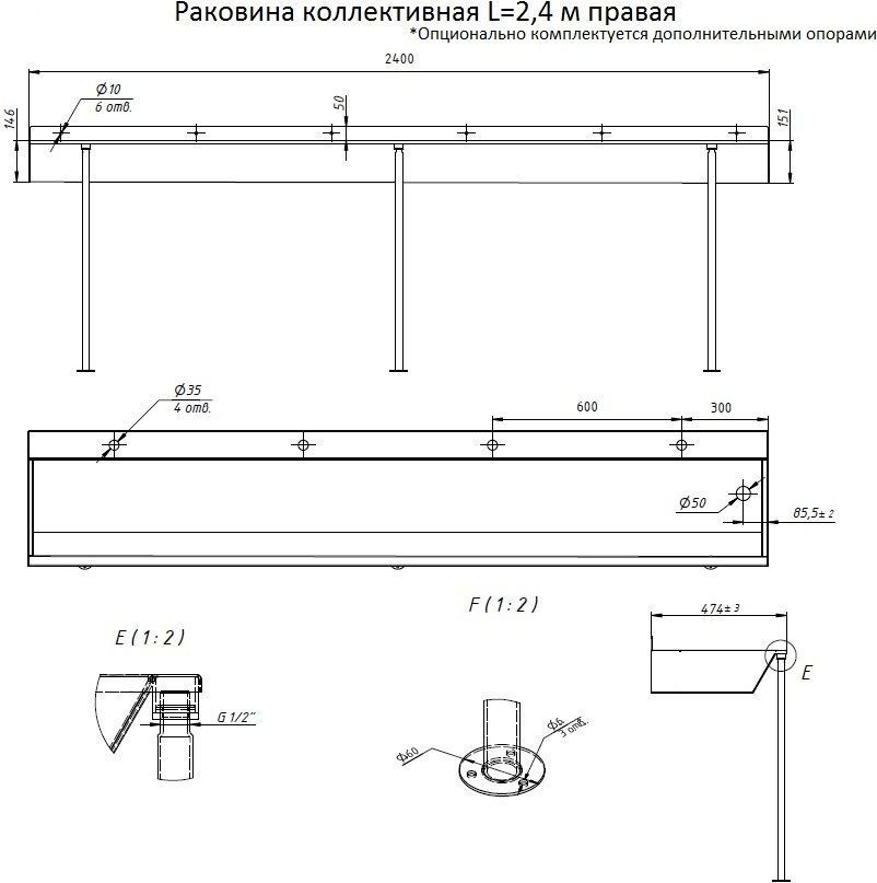Раковина подвесная антивандальная Тругор L=2,4 м (слив слева)