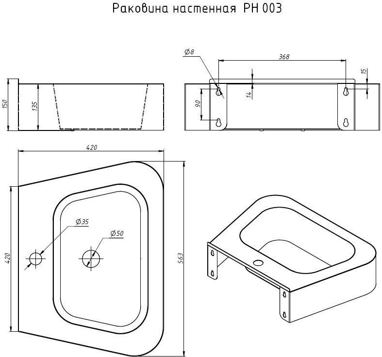 - Отверстие для смесителя: D — 35 мм
