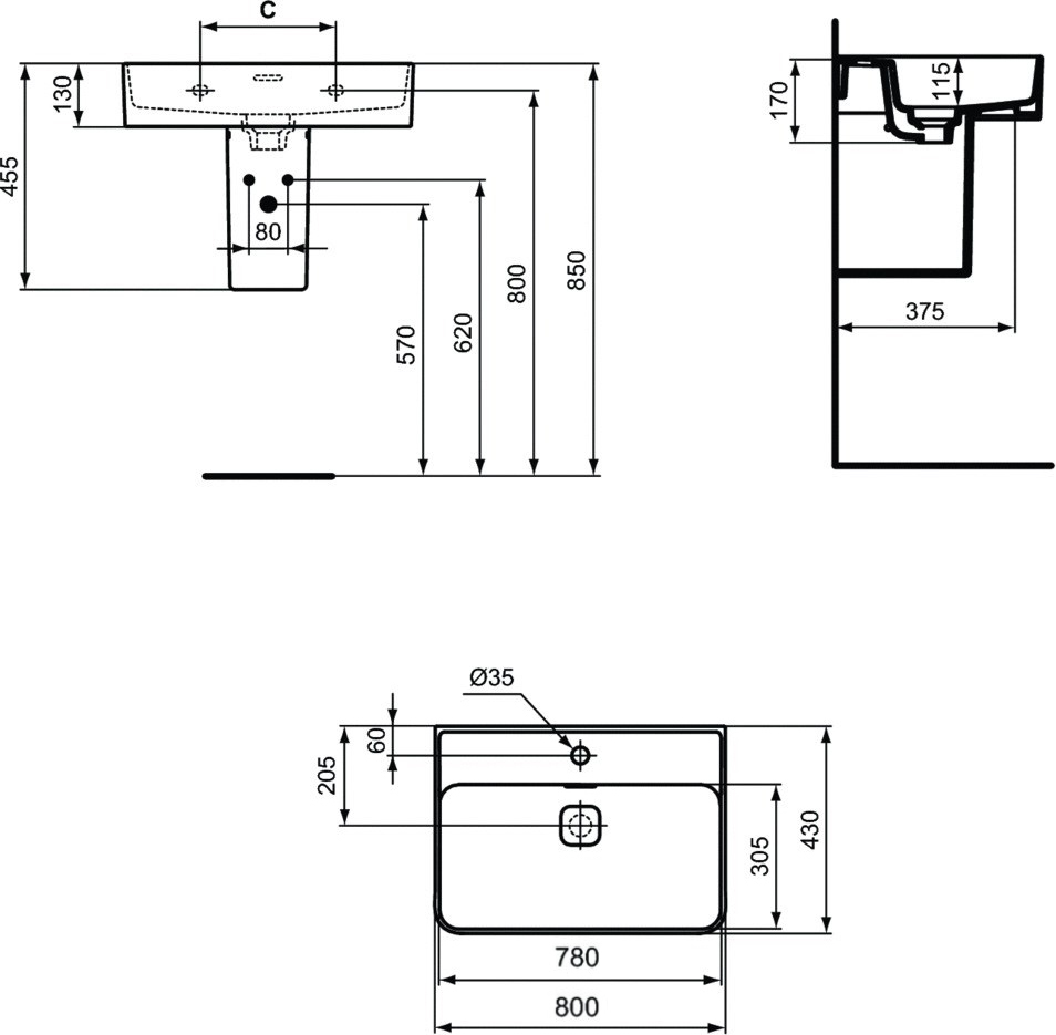 Раковина подвесная Ideal Standard Strada II 800х430х170 мм T300101 с отверстием перелива (щелевого типа), керамической накладкой слива (T854601) и 1-м отверстием под смеситель, цвет - белый.