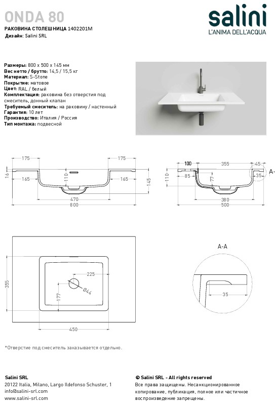 Раковина подвесная Salini Onda 80 1402201M, размер 800x500x140 мм, цвет белый.