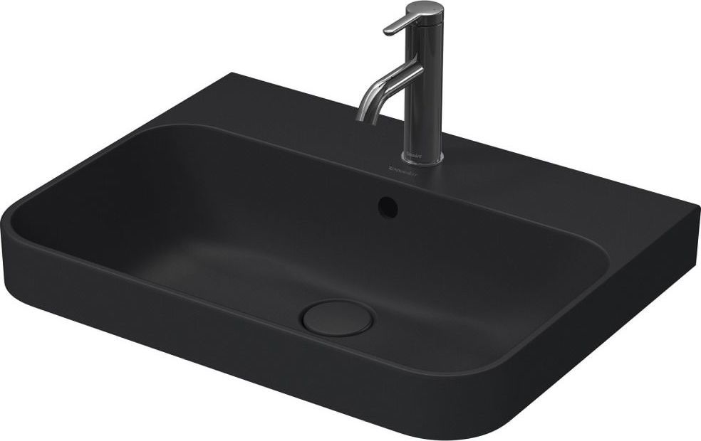 Раковина врезная на столешницу Duravit Happy D.2 Plus 60х46 см 2360601300, шлифованный вариант, с переливом, плоскостью под смеситель и креплением, задняя стенка неглазурованная, нажимной выпуск с керамическим покрытием включен, цвет антрацит матовый.