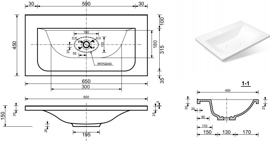 Раковина врезная на столешницу Эстет Bali 65 см, в комплекте вкладыш и слив-перелив. Цвет белый.