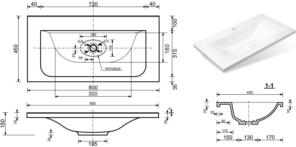 Раковина врезная на столешницу Эстет Bali 80 см, в комплекте вкладыш и слив-перелив. Цвет белый.