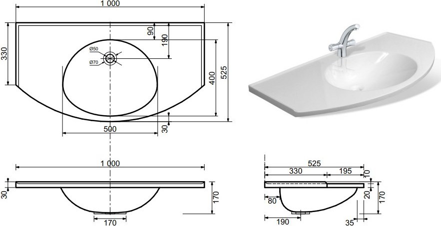 Раковина врезная на столешницу Эстет Флорида 100 см. Цвет белый.
