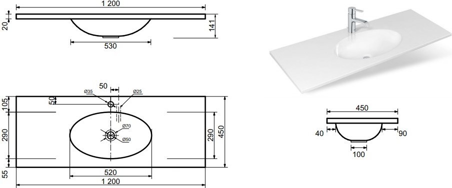 Раковина врезная на столешницу Эстет Вегас 120 см, в комплекте слив-перелив. Цвет белый.