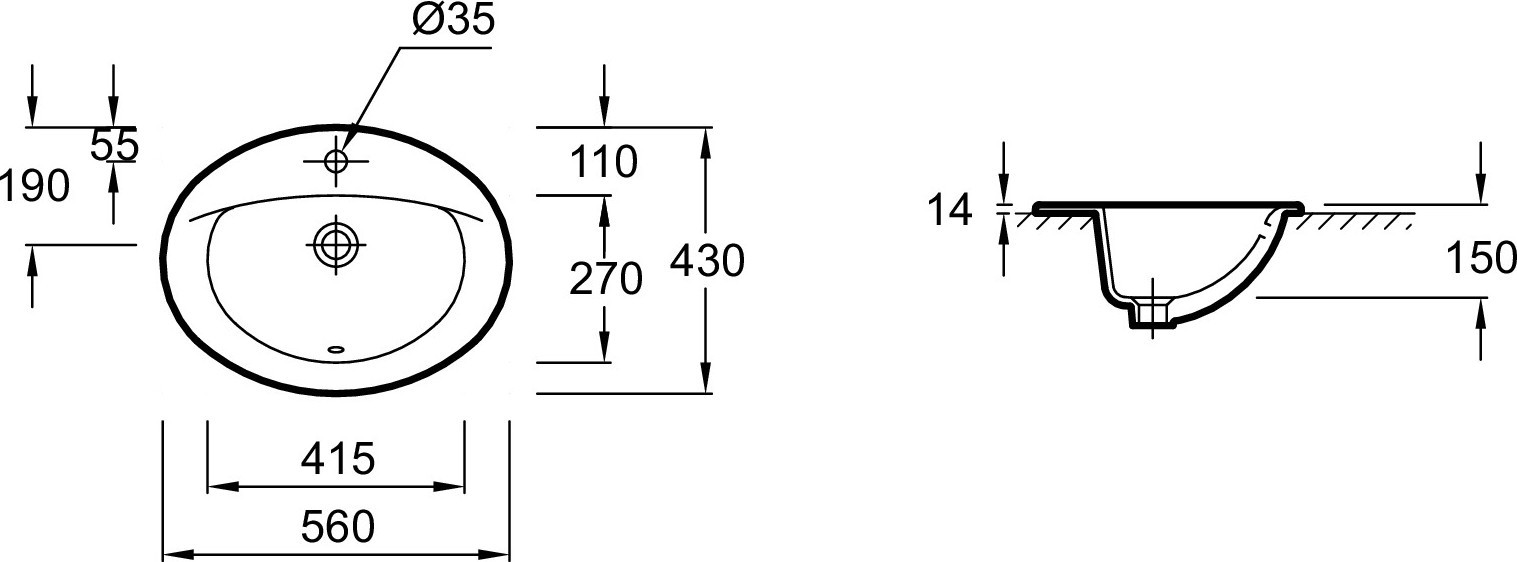 Раковина врезная на столешницу Jacob Delafon Odeon 560х430 мм E4155-00 с 1 отверстием для смесителя, два размечено, цвет - белый.