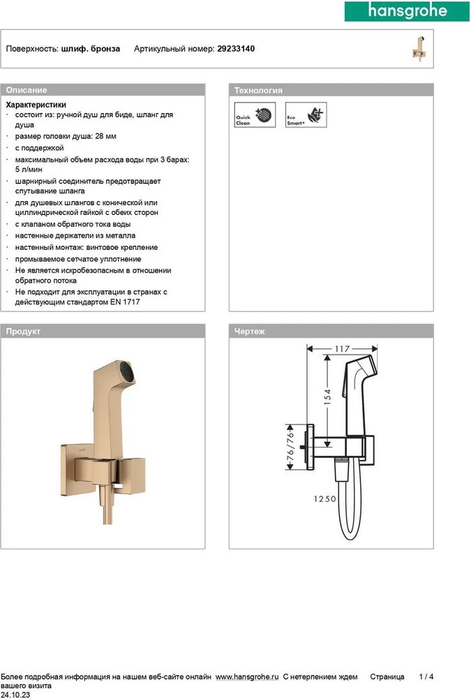 Характеристики гигиенический душ Hansgrohe (29233140)
