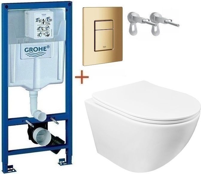 Инсталляция с подвесным унитазом комплект: Grohe Rapid SL 38772001+38732GL0 с подвесным безободковым унитазом Azario Grado AZ-0046 SP сиденье микролифт, крепление, кнопка смыва золото глянцевое