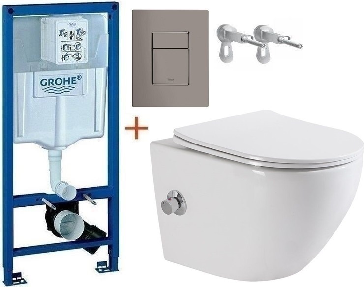 Инсталляция с подвесным унитазом комплект: Grohe Rapid SL 38772001+38732A00 с подвесным безободковым унитазом-биде BelBagno Uno BB3105CHR-BS/SC сиденье микролифт, крепление, кнопка смыва графит