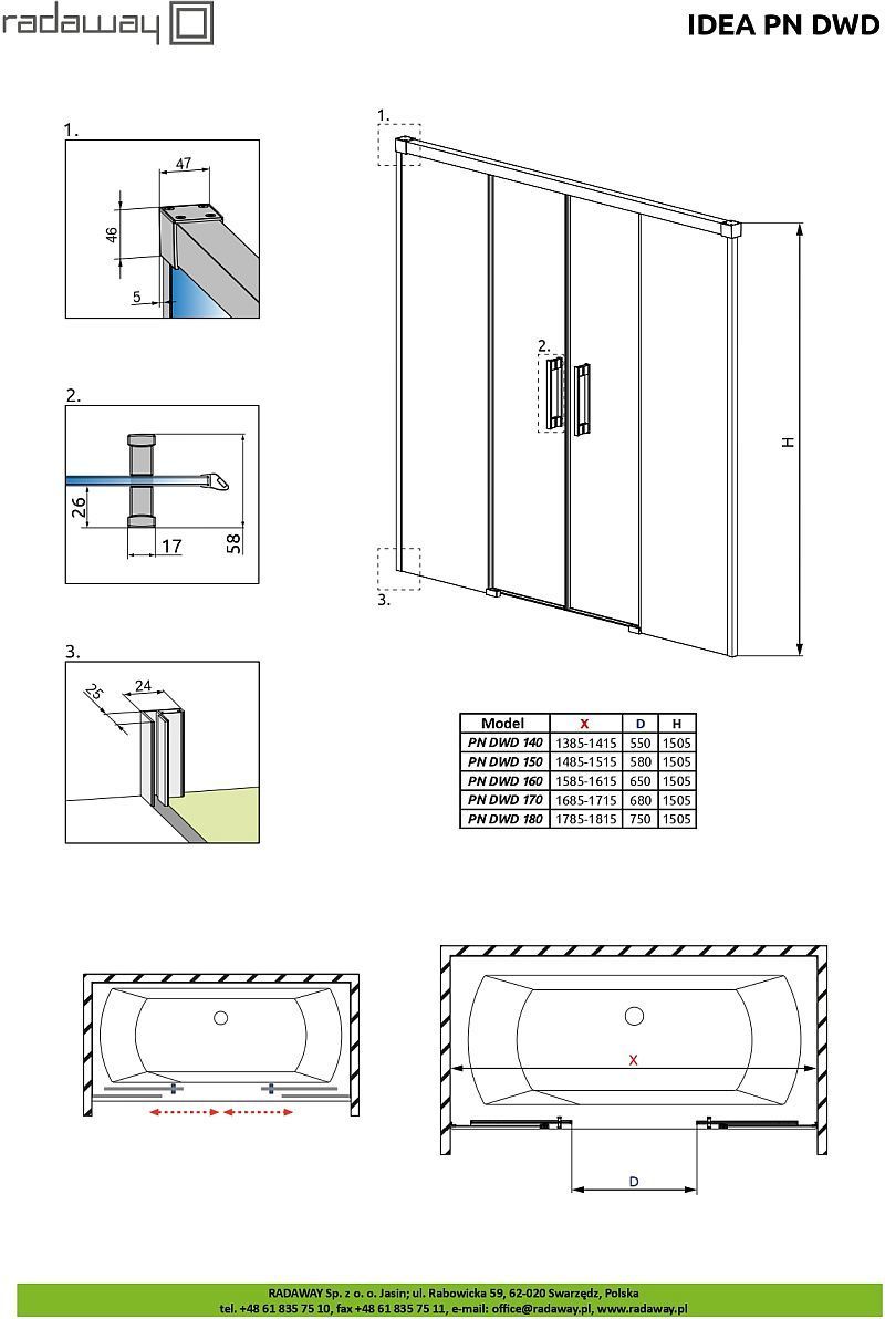 Шторка для ванны Radaway Idea PN DWD 1500х1500 мм. Цвет профиля – хром, цвет стекла – прозрачное, 6 мм. Размеры с диапазоном регулировок: 1485-1515 мм. Ширина входа: 580 мм.