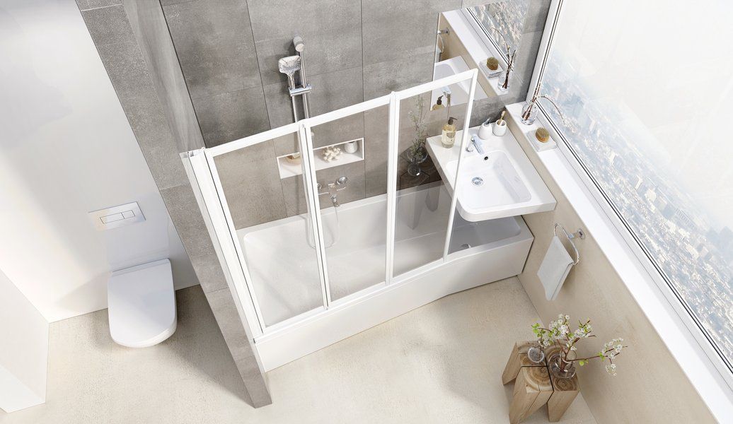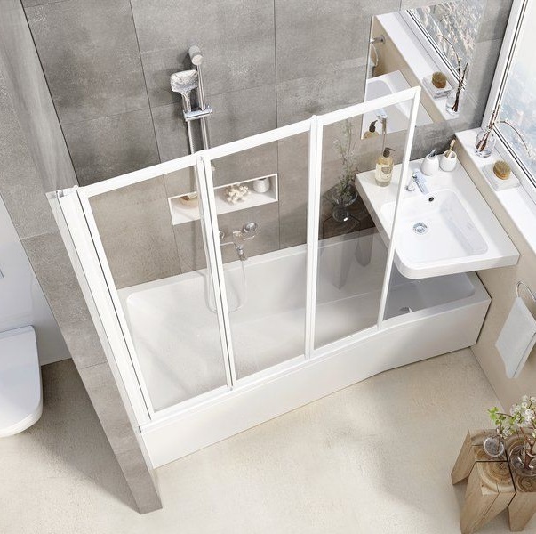 - Штора состоит из трех подвижных частей, которые складываются вовнутрь ванны.