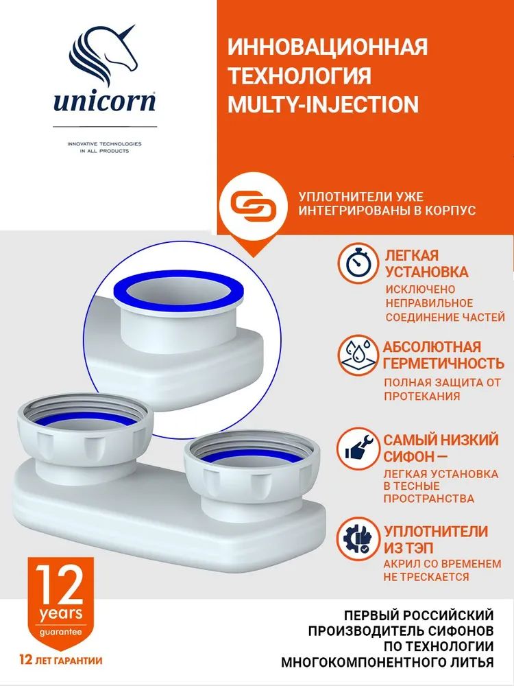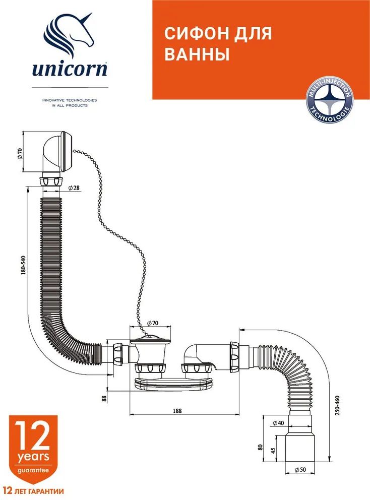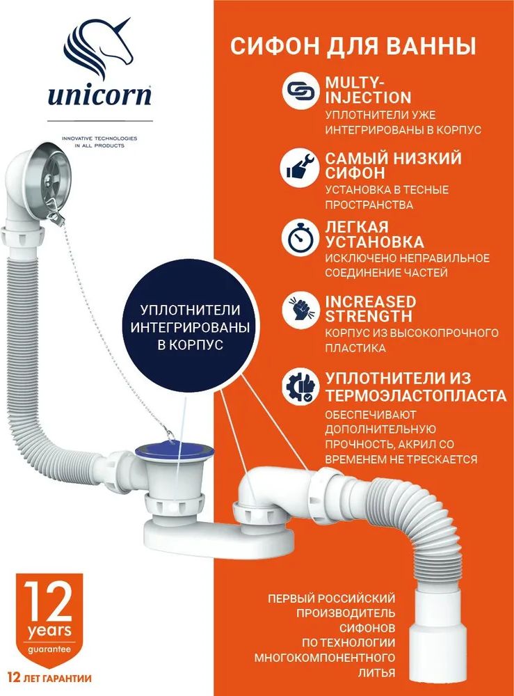 Сифон для ванны Unicorn S12 c отводом в канализацию.