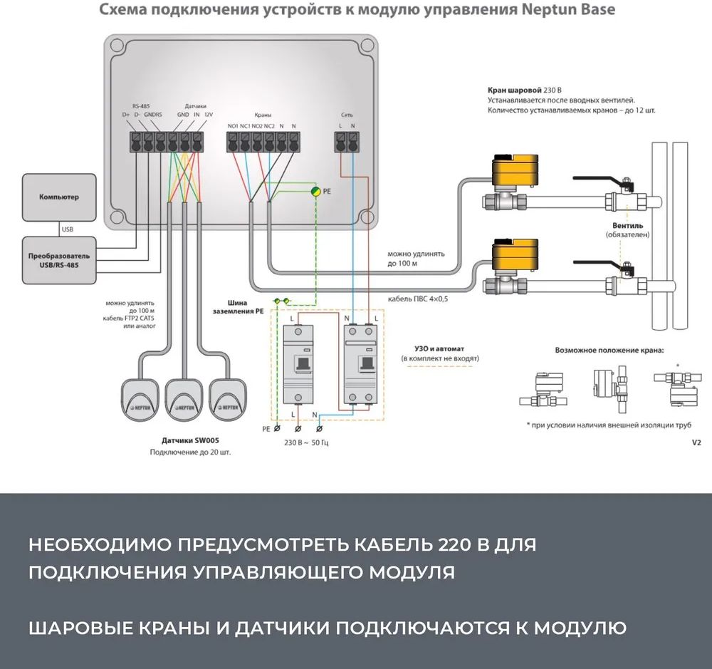 - Модуль управления: Подключение до 20 проводных датчиков и до 12 шаровых кранов