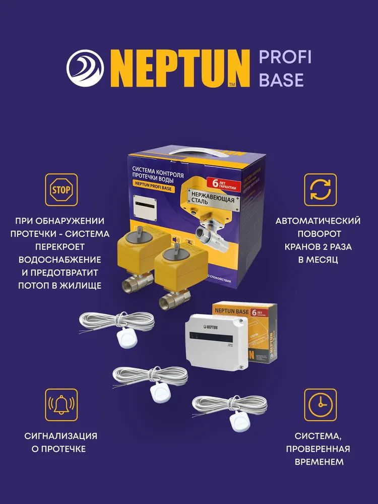 - Система контроля протечки воды Neptun Profi Base предназначена для своевременного обнаружения и локализации протечек воды в системе водоснабжения и отопления жилых домов, коттеджей, офисных зданий, магазинов. Система заблокирует подачу воды до устранения причин протечки и проинформирует о возникшей аварии звуковым и световым сигналами.